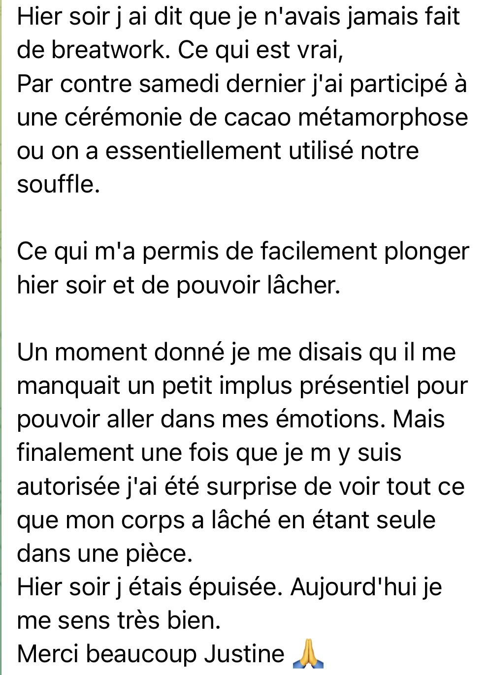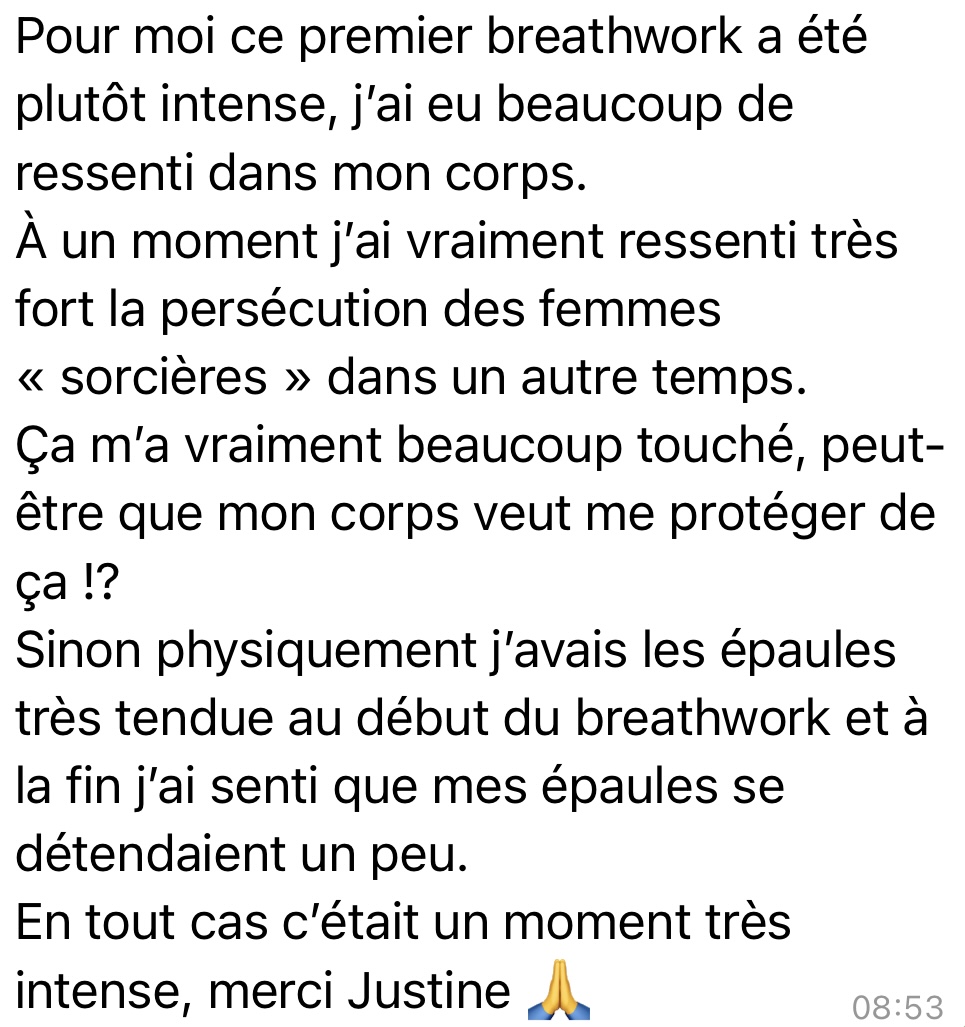 Je m’appelle Justine, accompagnante en respiration consciente et en réintégration corporelle.